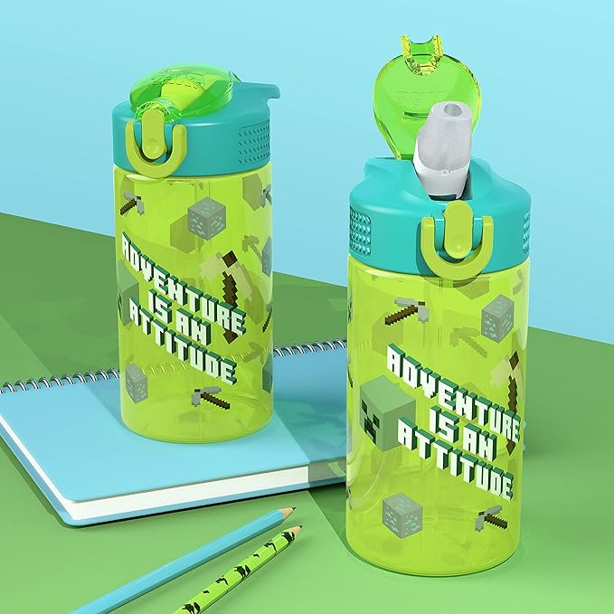 Zak Designs Kids Durable Plastic Spout Cover and Built-in Carrying Loop, Leak-Proof Water Design for Travel, (16oz, 2pc Set), Minecraft Bottle 2pk