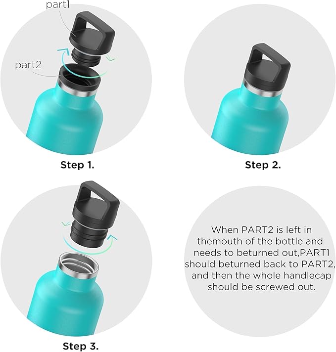 - THOUGHTFUL LID DESIGN(bpa free): Standard mouth stainless steel water bottle has two different stlyes of lids, straw lid and handle lid with strainer so you don't have to worry about ice slipping into mouth. Vacuum water bottle comes standard with an attached PP material screw cap that creates on air–toght vacuum send and is great for travel and outdoor use. Stainless steel drinking bottle also comes with a sport cap and a straw whoch is great for gym/sport activities