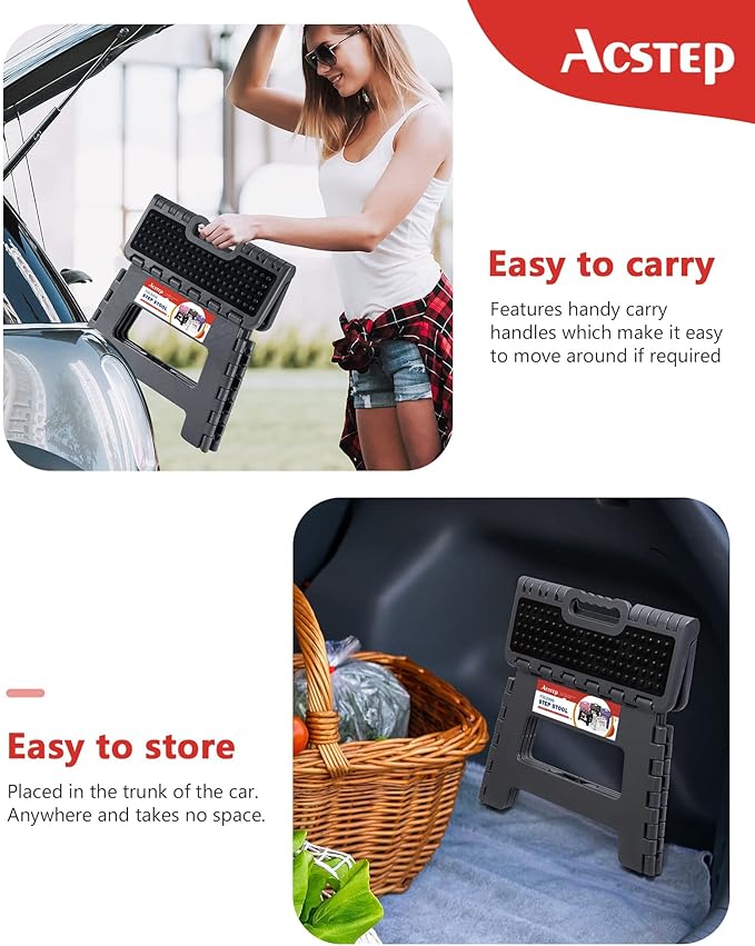 - 【2022 Safe Upgrade Step Stool】: ACSTEP folding stool 2021 Upgrade designed a safety stop gap feature that allows the foldable stool to prevent being squashed,And unique embossing design provides comfortable to sit sn and Non-Slip