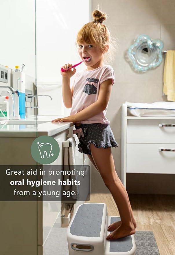 - Great Aid Oral Hygiene Habits :This kids' step stool is an ideal tool to support children's independence during daily routines. Specifically, it provides the necessary height boost for little ones to comfortably reach the sink, aiding them in brushing their teeth.This makes the step stool a great aid in promoting oral hygiene habits from a young age.