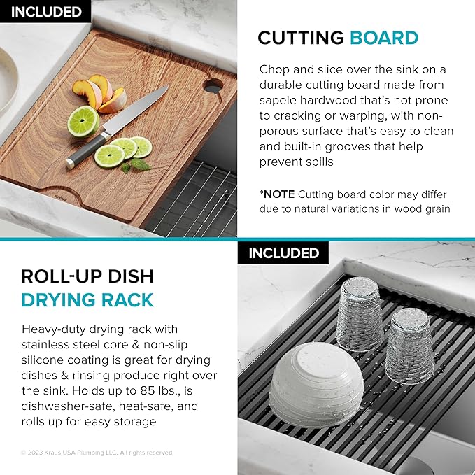 - WORKSTATION SINK with integrated ledge for sliding accessories allows you to work right over the sink while minimizing clutter on the kitchen counter – Chop and slice on the durable bamboo cutting board or dry dishes on the heavy-duty rolling mat