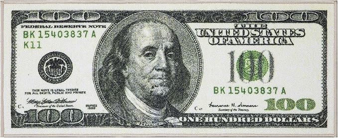 - [TRENDY STYLE]: This Colorful Money Money Rug features a 100 dollar bill print in shades of green and gray on a beige background while also adding color and enhancing the look of your home. Its timeless design can be integrated into a variety of home décor styles.