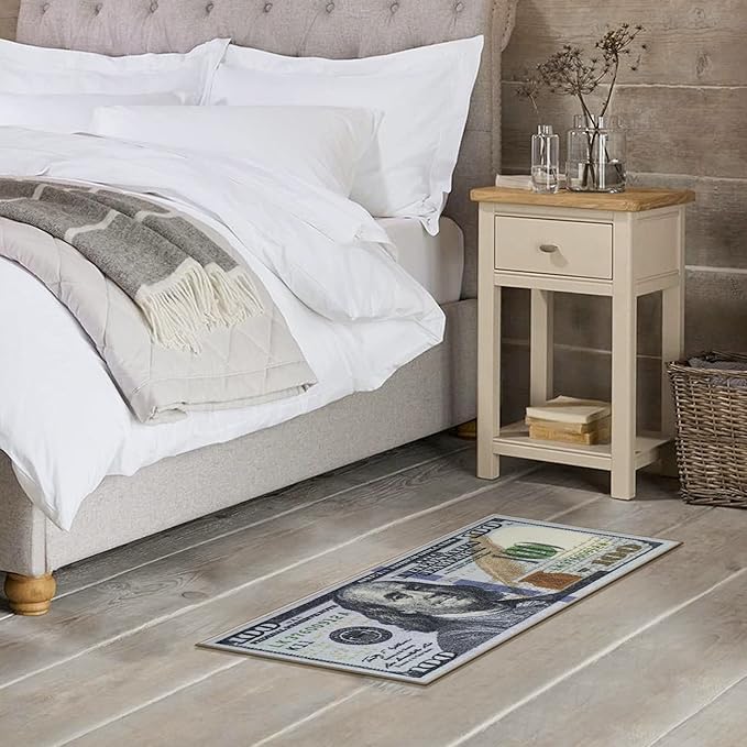 - [TRENDY STYLE]: This Colorful Money Money Rug features a 100 dollar bill print in shades of green, gray, gold, and blue while also adding color and enhancing the look of your home. Its timeless design can be integrated into a variety of home décor styles.