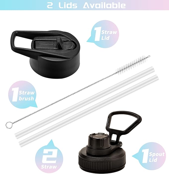- 【2 Lid Availabl】It comes with 2 compatible and leakproof lids to fit your every need. One spout lid with screw cap allows for fast water flow when you're feeling the burn. Another straw lid allows you to enjoy spill-proof sipping without efforts. They allow easy one-handed or hands-free drinking even when you're busy. Perfect for any indoor and outdoor activities.