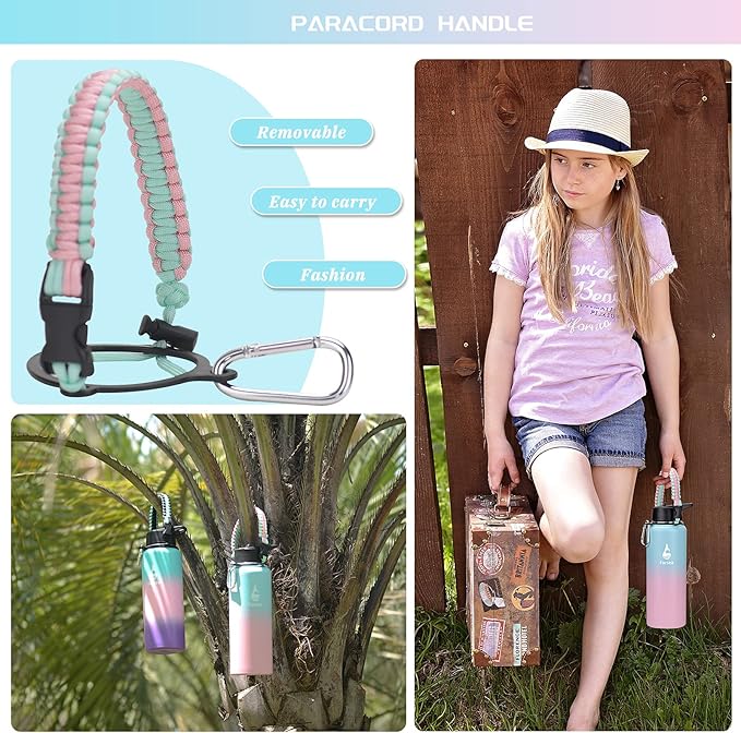 - 【Personalized Paracord Halder 】Be made with high quality and durable 550 + 350 Military-grade Nylon Paracord. The Detachable Paracord Strap and Carabiner attach to just about anything: belt, backpack, stroller, purse, luggage, tree branches. It is easy and convenient to carry the sports water bottle around.