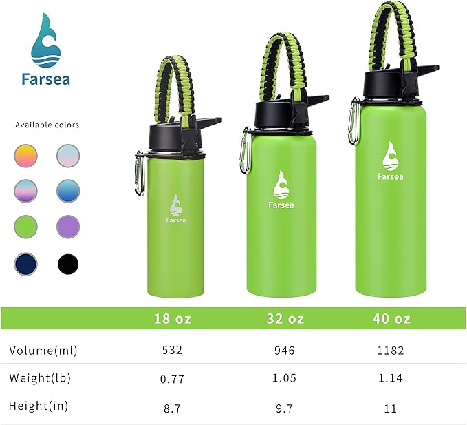 - 【What You'll Get】 Farsea is committed to providing the best value and highest quality to the customers.We offer Continuous After-sales Service and Solve All Problems. We offer several different capacity bottles(18oz, 32 oz, 40oz) and you can choose according to your needs. Package: Comes with 2 lids (Straw lid & Spout Lid), 1paracord holder, nice packing box,2 straws, and straw brush.