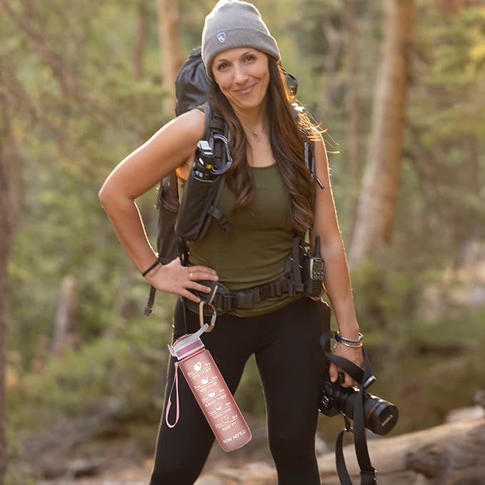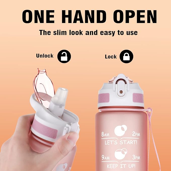 - FLEXIBLE DESIGN: Motivational water bottle with a pop-up silicone straw design, equipped with food-grade silicone straws, ensure you to drink healthy water. Simply open with one hand by clicking the button. Locking mechanism prevents leakage. With a sturdy carry-strap is this motivational water bottle easy to carry and fits your cars cup holder, gym fitness equipment cup holder, backpack, etc
