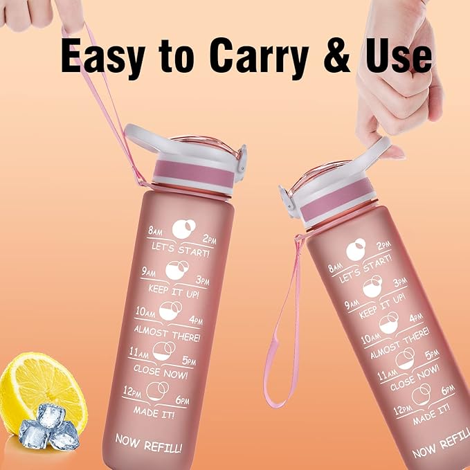 Prometheuz 32oz Water Bottle with Straw, Motivational Water Bottle with Time Marker, Water Bottles Leakproof & BPA-Free for Sports, Work and Fitness Rose Gold