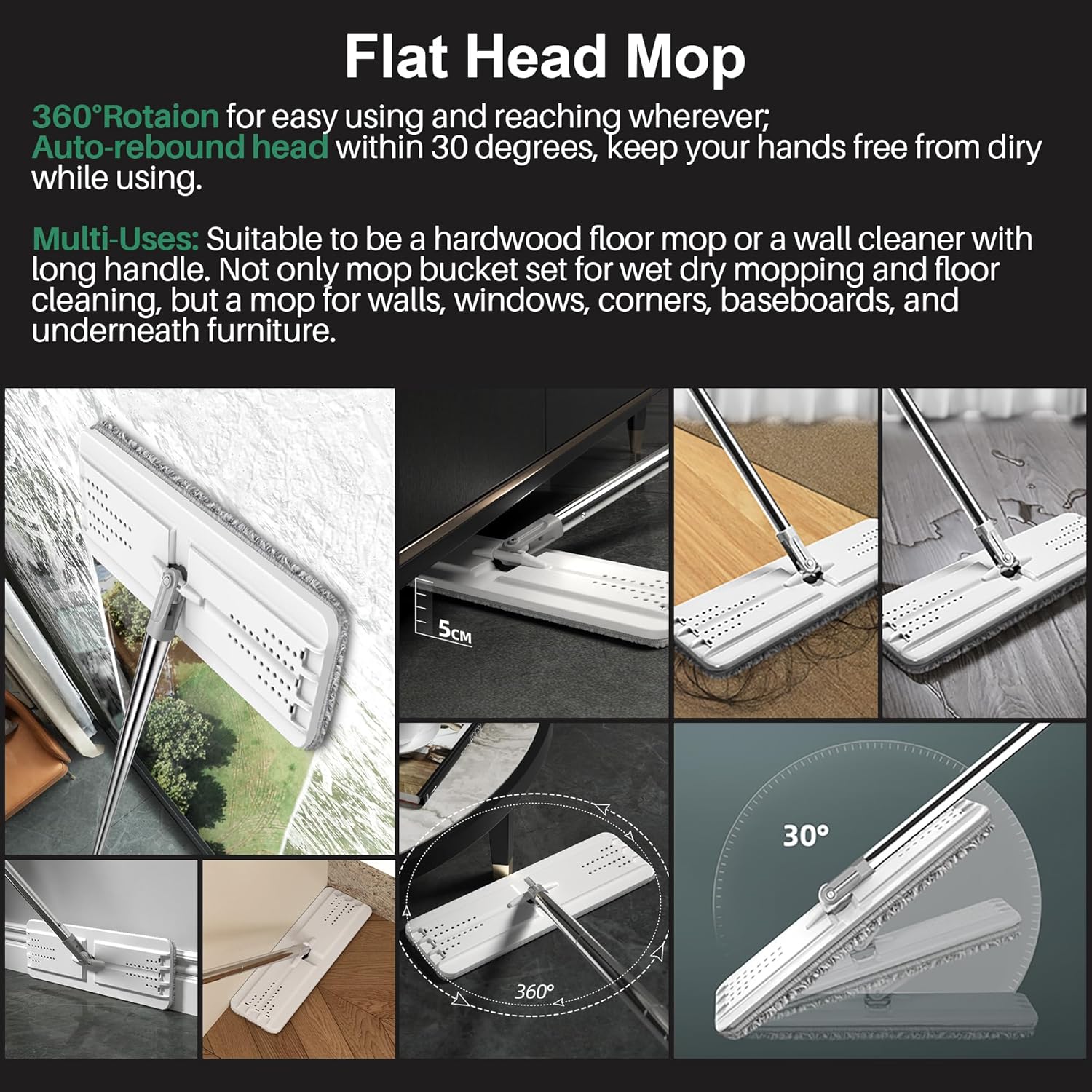 - [MOPS FOR FLOOR CLEANING] With 360° rotation mop head, it can reach to wall, any corners and those "under-the-whatever" places. And adjustable Stainless Steel Handle can be extended from 26.5 to 50.0 inches, do mopping with your whole family members by this Clean Home Mop.