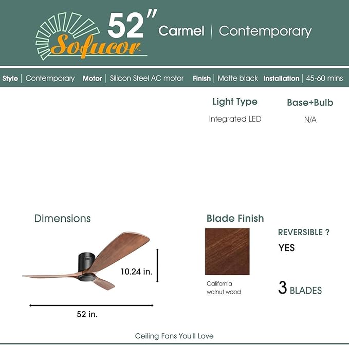 Sofucor 52" Flush Mount Ceiling Fan no Light and Remote Control, Indoor Outdoor Ceiling Fans Without Light, Quiet Energy Saving with 6 Speeds, Timer, Brown