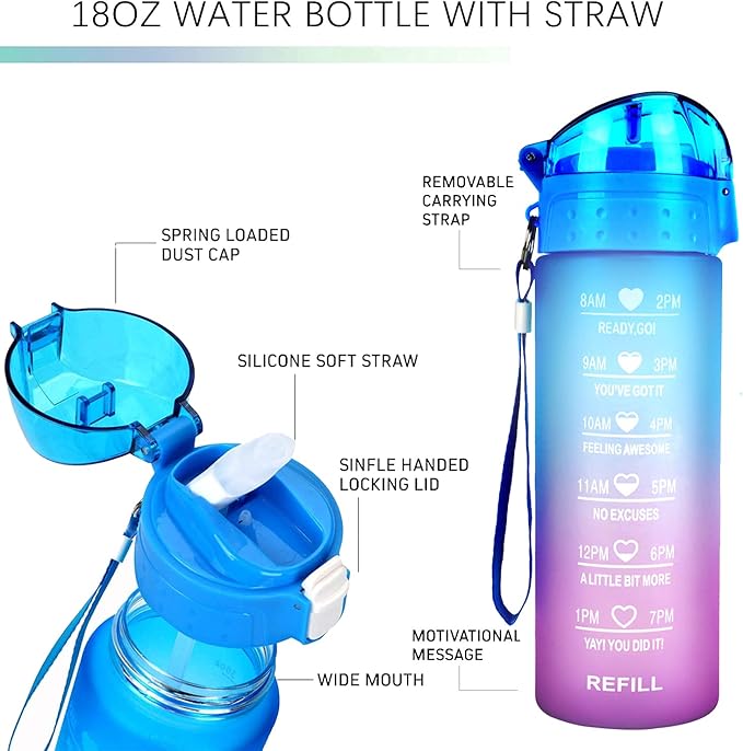 - 【High Quality】- 18oz water bottle is made of food grade Tritan which is very durable, each water bottle comes with straw brush to clean the straw and add a cup brush to clean drink bottles. In dimension, the cup bottom width is 2.3". By the way, 18oz water bottle is the perfect size for everyday use and most car cupholders friendly choice.