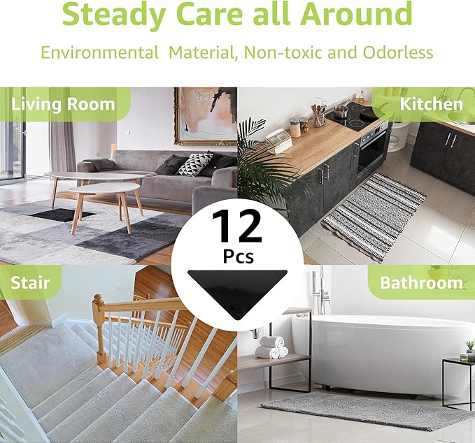 - Advantaged Triangle Design: The Triangle Design grippers for area rugs and hardwood floors will maximum increase the contact surface. The strong adhesion will help stick firmly and keep your area rugs in place. Moreover, the rug stickers for wood floors will prevent the rug corners and edges curling and always keep your rugs steady and safe