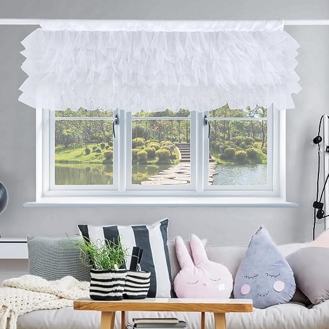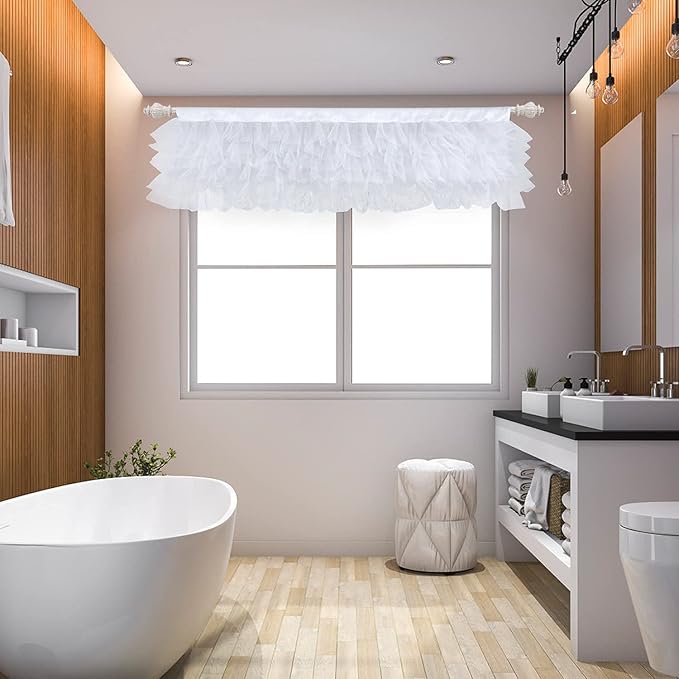 White Tulle Valance Ruffle Kitchen Valance for Bathroom Bedroom Coffee Shop Kids Nursery Room Window 52×16 inch