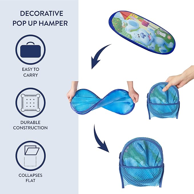 - DESIGN: Pop up hamper featuring Blues Clues printed with iconic graphics from the famous brand. This pop up hamper features your child's favorite characters and will make an adorable addition to a bedroom or bathroom décor.
