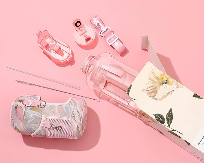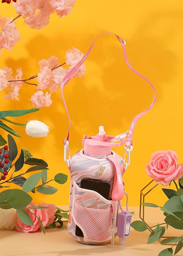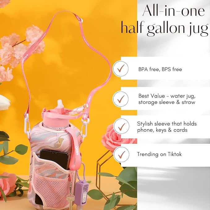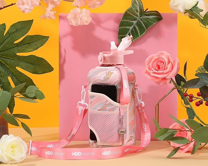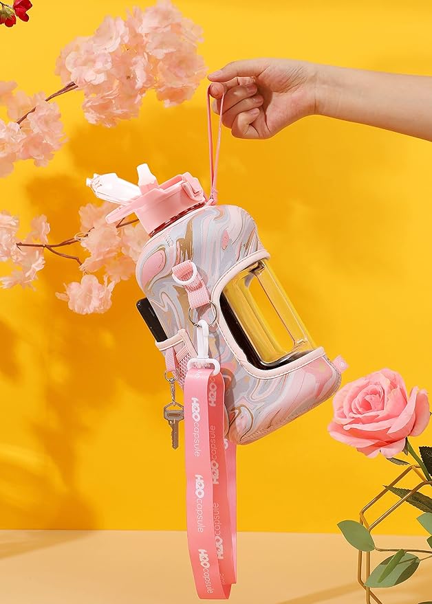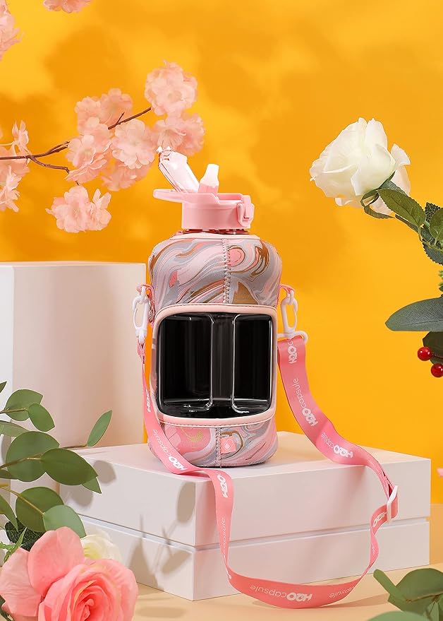 H2O Capsule 2.2L Half Gallon Water Bottle with Storage Sleeve and Removable Straw – BPA Free Large Reusable Drink Container with Handle - Big Sports Jug, 2.2 Liter (74 Ounce), Pink Marble