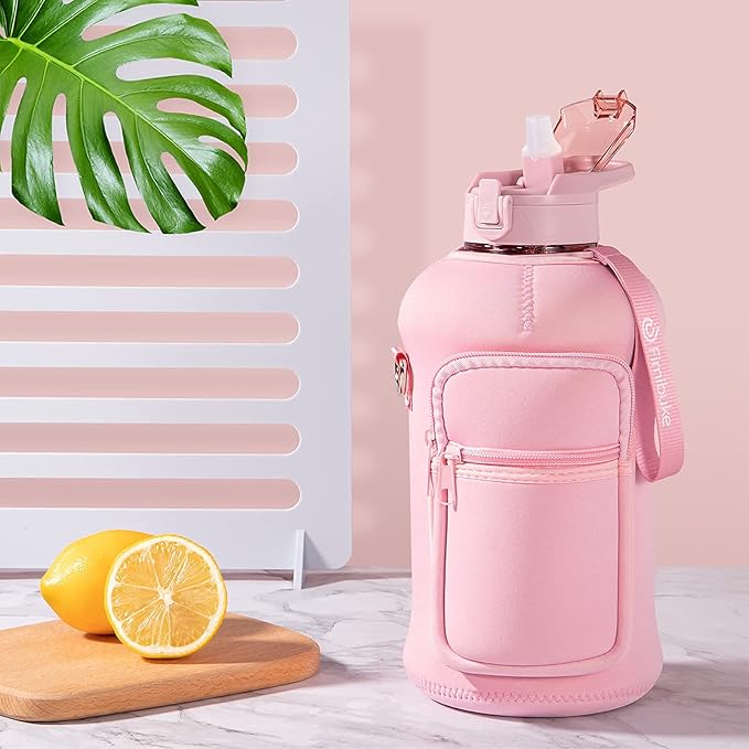 - INSULATED STORAGE SLEEVE: Our water bottle is designed with a high quality 5mm Neoprene sleeve, which not only can protect the water jug from slight bumps, but also keep water cold longer(water bottle is not insulated) and absorb messy sweat to avoid dripping on the table or seat. 2 zipper pocket is designed for storing your phone, card, airpods, etc. Comes with a adjustable & removable padded shoulder strap that can be adjusted from 25" to 50" to offer you more carrying options and hands free.