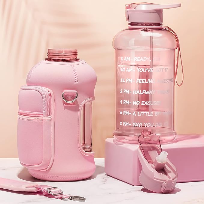 - STAY HYDRATED: Designed with time marker and inspirational quotes, Fimibuke half gallon water bottle is perfect for helping you stay motivated to drink enough water throughout the day. Featured with clear appearance and capacity scale helps you measure your daily intake of water easily and clearly. Featured with Wristband & hand held & shoulder strap that offering you with three way to carry, perfect for workout, traveling, running, hiking, cycling, camping, Yoga, or any other sports.