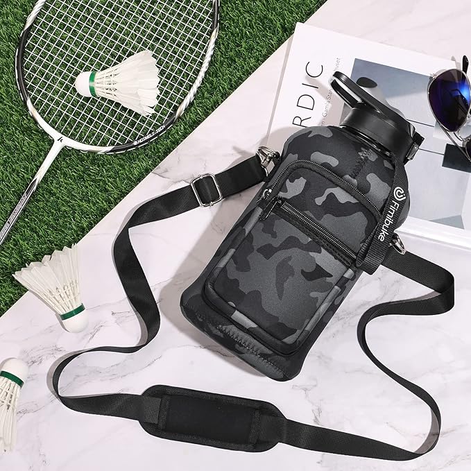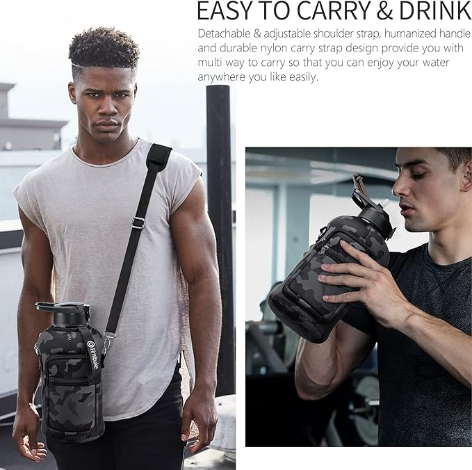 - INSULATED STORAGE SLEEVE: Our water bottle is designed with a high quality 5mm Neoprene sleeve, which not only can protect the water jug from slight bumps, but also keep water cold longer(water bottle is not insulated) and absorb messy sweat to avoid dripping on the table or seat. 2 zipper pocket is designed for storing your phone, card, airpods, etc. Comes with a adjustable & removable padded shoulder strap that can be adjusted from 25" to 50" to offer you more carrying options and hands free.