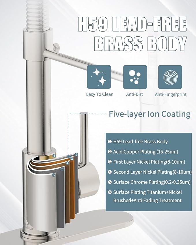 - 【EASY MAINTENANCE】Lead-free solid brass body and commercial SUS 304 stainless steel spring construction forged products. Brushed Nickel surface treatment added 18/8 Chromium/Nickel content provides a superior anti-corrosion and anti-rust finish that prevents dirt such as fingerprints or water stains from adhering to the faucet surface, making the kitchen look cleaner. Daily cleaning with a cloth or water is enough, less time cleaning and more time having fun with your family.