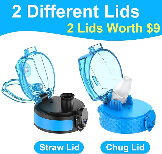 OLDLEY Kids Water Bottle for School with Straw Chug Lid, 15 oz Unbreakable Leak-Proof BPA-Free Motivational Water Bottles with Time Marker for Travel Sports Gym, 2 Lids, Blue