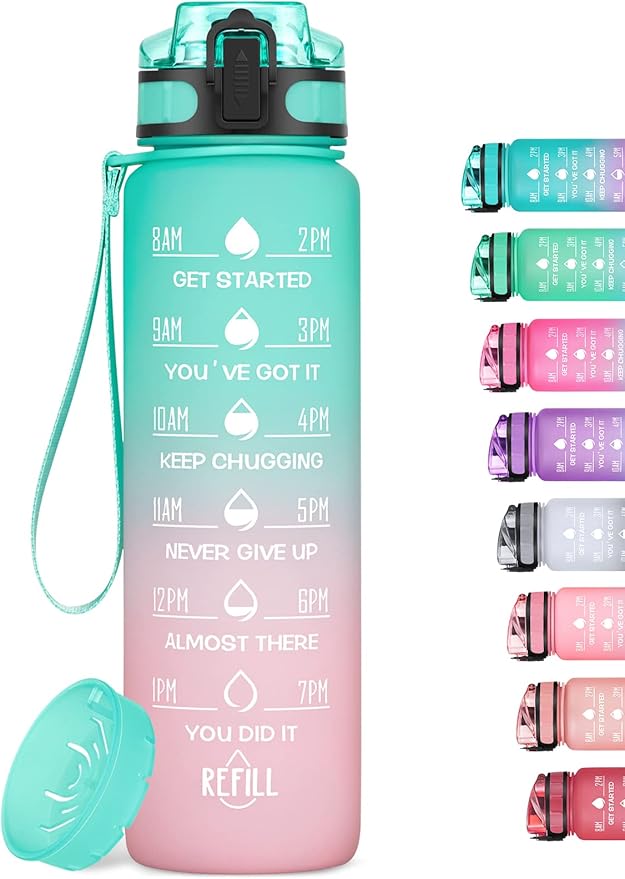 - 💦 Innovative Time Marker : With unique inspirational quote and time marker on it ,our 32oz water bottles will no doubt help you measuring your daily intake of water and motivate you to drink more. This water bottle is perfect for those who want the extra encouragement to drink more water to nourish the skin, improve their immunity and metabolism.