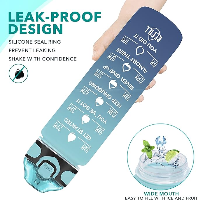 - 【Motivational Quote & Time Marker】32 oz water bottle with unique inspiration quote and time marker, reminding you to stay hydrated. The capacity marker helps you tracking daily water intake. A silicone straw makes you enjoy spill-proof sipping without effort. A necessary have for people of different occupations such as athletes and white-collar workers.