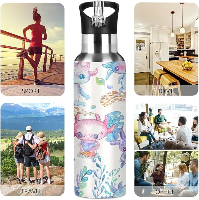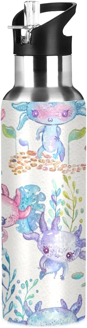 Axolotl Sports Water Bottle, Double Wall Vacuum Insulated Stainless Steel Water Bottle with Straw Keeps Hot and Cold, Bike Running Sports Travel Gym 20oz