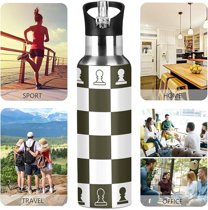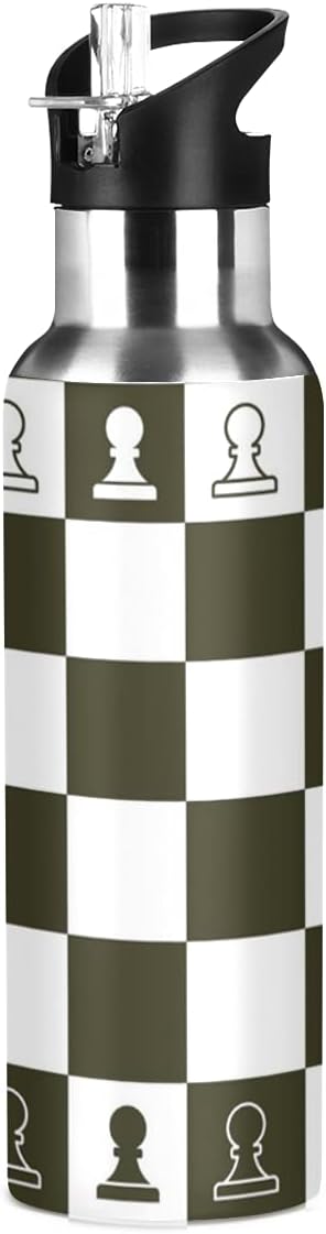 Chess Sports Water Bottle, Double Wall Vacuum Insulated Stainless Steel Water Bottle with Straw Keeps Hot and Cold, Bike Running Sports Travel Gym 20oz