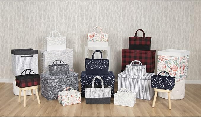- The attached hinged lid features a tailored fold-over finish that brings an elevated elegance to this everyday storage bin