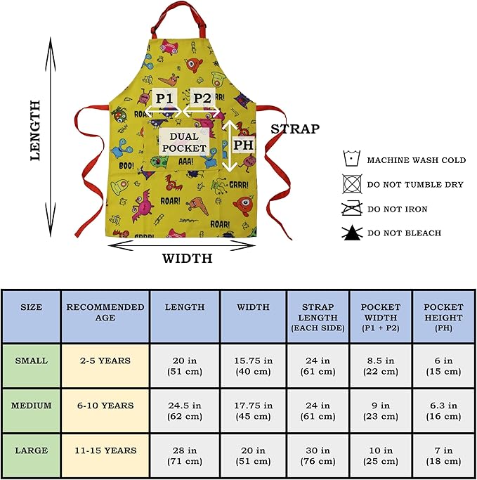 - THREE SIZES FITS KIDS 2-15 YEARS – (Small - 2 to 5 years, Medium – 6 to 10 years and Large - 11 to 15 years). For details about size, refer to the images. Apron features (1) Adjustable neck buckle/strap makes it easy to put on and take off the apron. It also accommodates the needs of a rapidly growing child. (2) Long and sturdy waist tie aids a perfect fit. (3) Dual front pocket provides plenty of room for small tool / tools, accessories, art / craft supplies and keeps hands free.