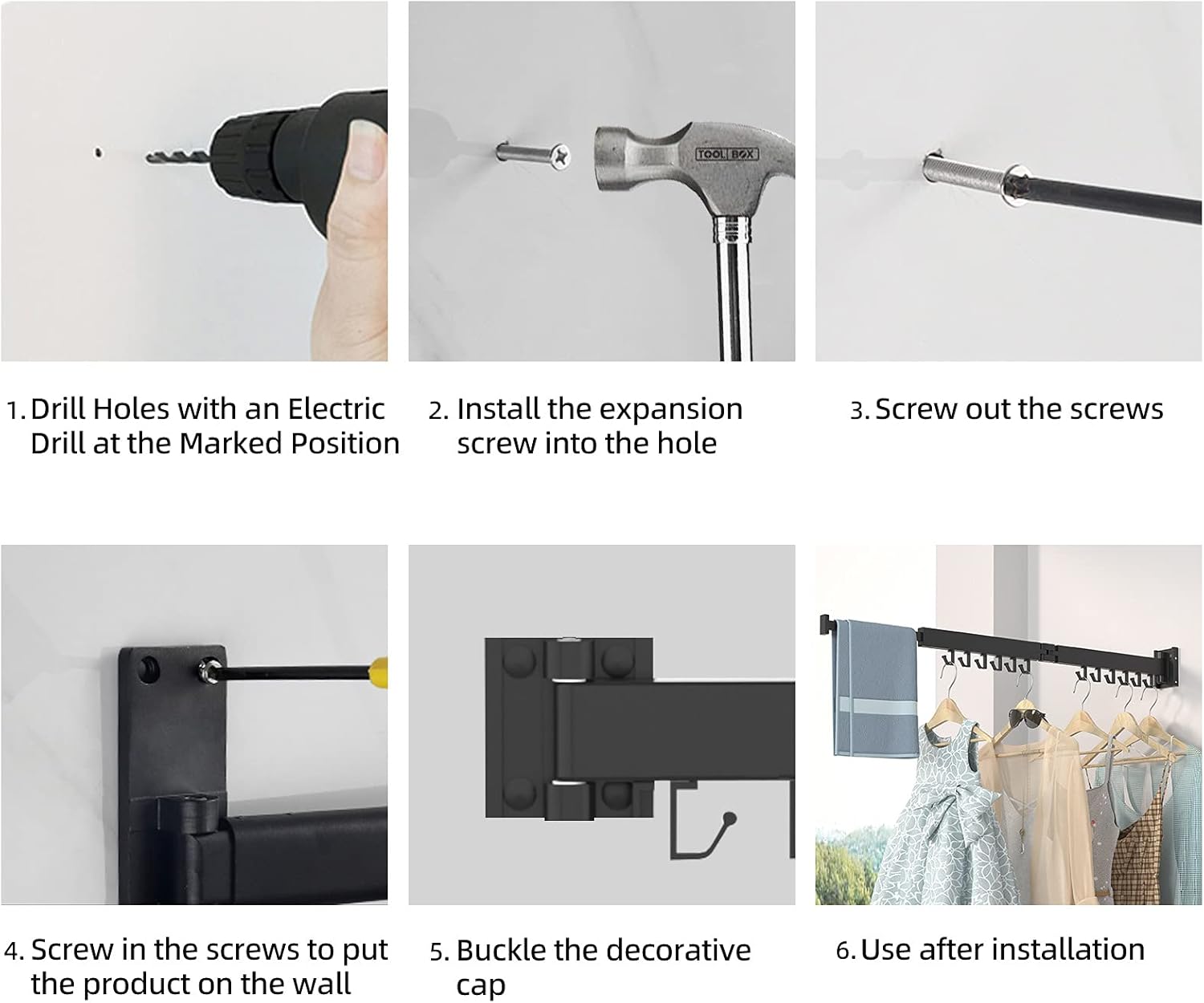 - ✅ Punch-free & Drilling Installation to Choose -- Whether you prefer a punch-free installation (With No-Drill Adhesive: Clothing Weight⩽60 LBS) or traditional drilling, our clothes drying rack wall mounted offers simple installation methods suitable for various surfaces, including smooth ceramic tiles, ensuring it fits perfectly in your space. (Tips: Please make sure the wall or wood board is solid before installation.)