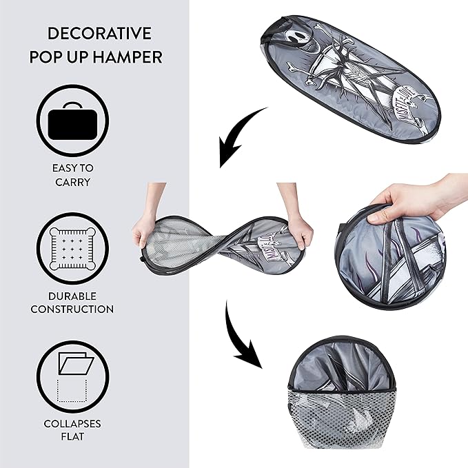 - GREAT GIFT: A useful and great gift for someone dear to you. For all the Nightmare Before Christmas fans, this hamper will put a smile on your loved one’s face, making them look forward to each day that comes. Laundry or putting away toys doesn't have to be a chore, make it easy with this spacious pop up hamper. Also, the perfect gift for home décor.