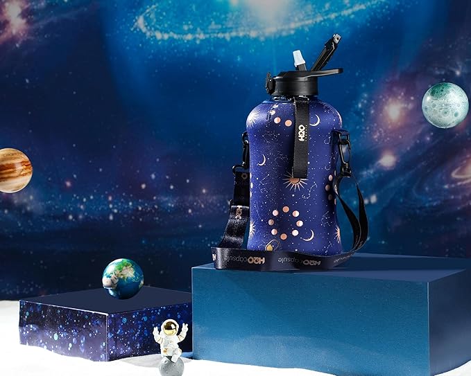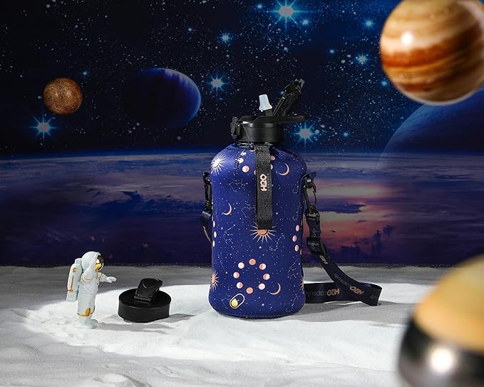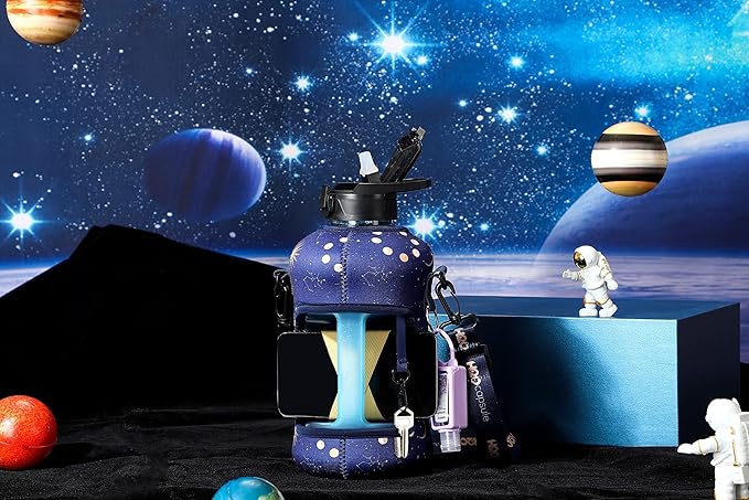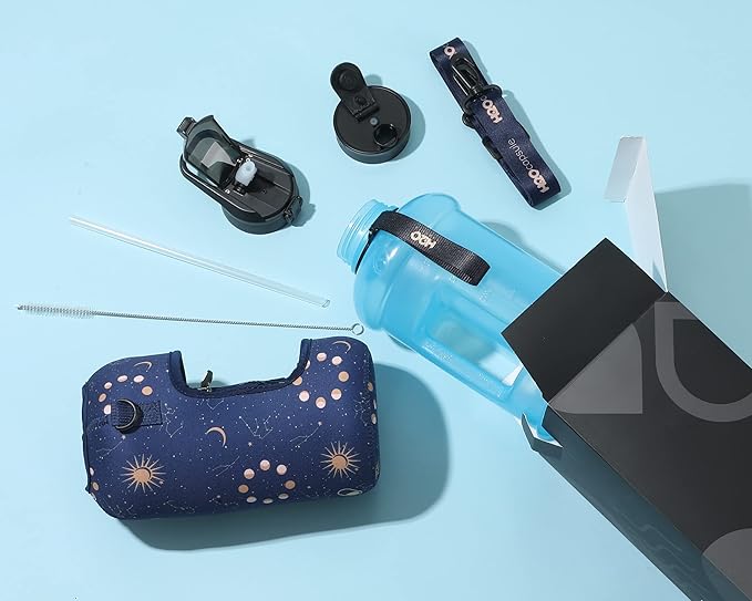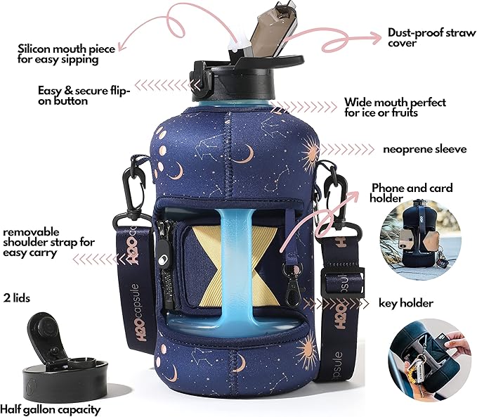 - HALF GALLON HYDRATION WITH COVERED STRAW LID: The extra large 2.2L / 74 oz plastic jug holds all the water you need to stay hydrated while you exercise. The reusable half gallon comes with a leak-proof & dust-proof covered straw lid, which helps protect the mouthpiece and flips open with a click of a button. The straw-lid is air-sealed: Run straw brush through mouth piece before initial use. The H2O Capsule bottle with storage sleeve comes with a bonus straw cleaning brush.