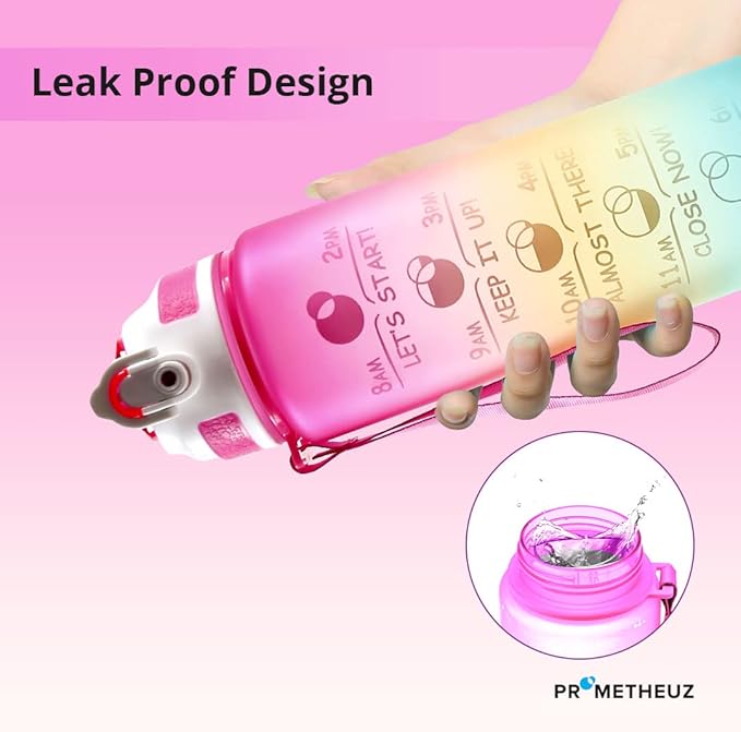 PROMETHEUZ Sports Water Intake Reminder Bottle with Time Marker and Straw, Leakproof Tritan BPA-Free, Fast Flow, Pink Yellow Mint, 32 oz