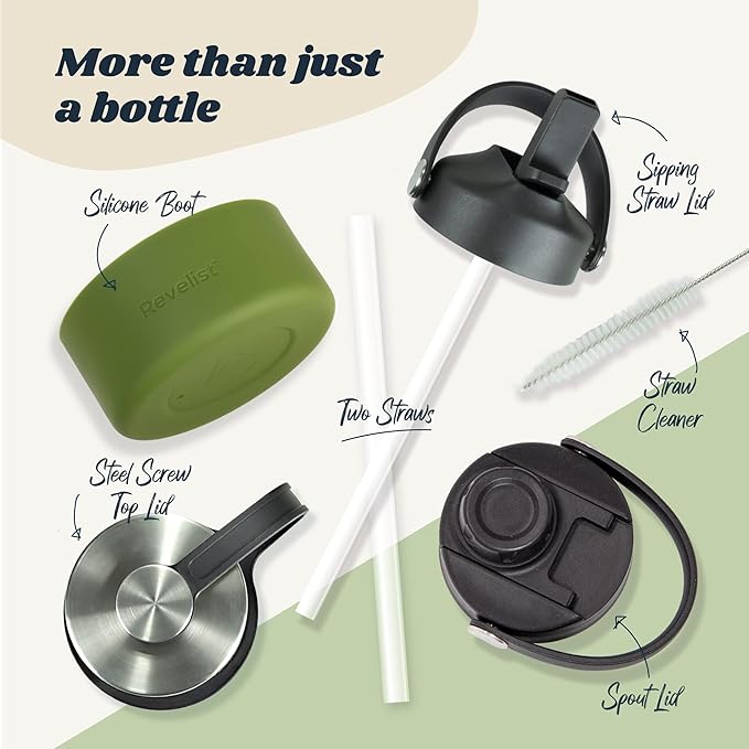 - GREAT VALUE: Every Revelist 32 oz water bottle comes with THREE different 100% LEAK PROOF lids - Straw Lid with 2 Straws, Flip Top Spout Lid and Stainless Steel Screw Top Lid - along with protective silicon boot and straw cleaner.