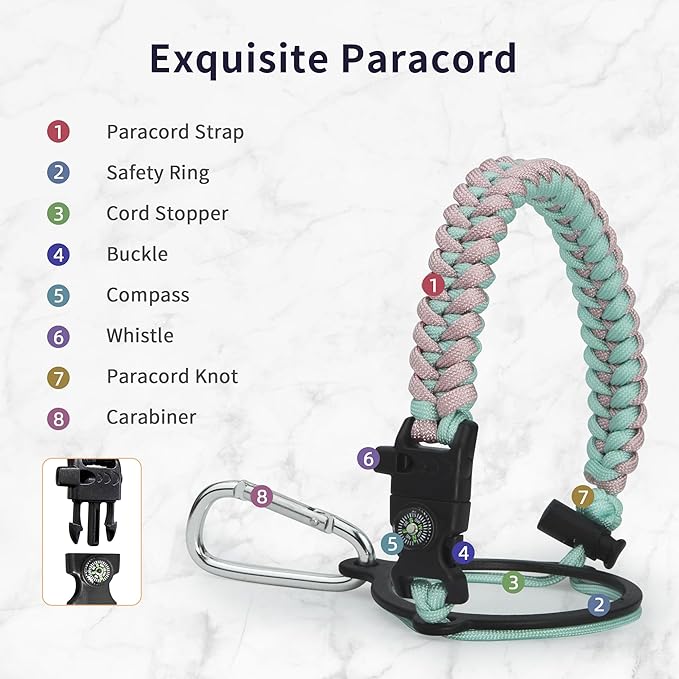 - Full-function Paracord: Brilliant paracord of matching colors bring out the bottle with a touch of youthful vibe. Compact compass and handy carabiner make the bottle the ideal survival kit for expeditions in the wild.