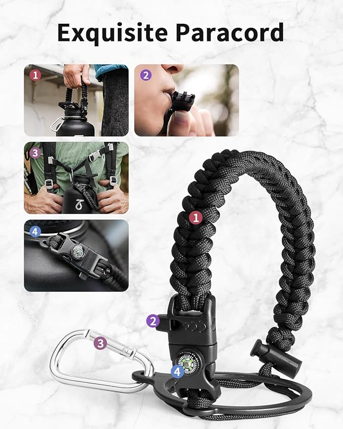 - Full-function Paracord: Brilliant paracord of matching colors bring out the bottle with a touch of youthful vibe. Compact compass and handy carabiner make the bottle the ideal survival kit for expeditions in the wild.
