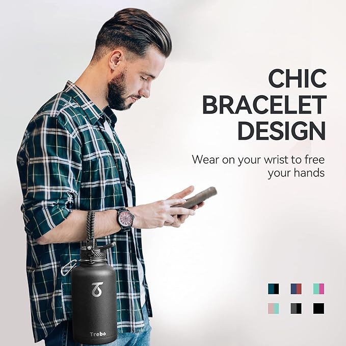 Trebo Half Gallon Water Bottle with Paracord Handle 64oz Wide Mouth Insulated Double Wall Stainless Steel Large Sports Flask Keep Hot 24 Hours & Cold 48 Hours Water Jug with 3 Lids, Black