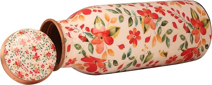Pure Copper Water Bottle - Handcrafted - Ayurveda health benefits - Large 17.50 oz - Leak proof - Easy to carry for Sports, Fitness, Yoga, School - White Base Floral Vintage Colors Enamel
