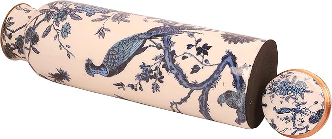 Pure Copper Water Bottle - Handcrafted - Ayurveda health benefits - Large 35 oz - Leak proof, Easy to carry for Sports, Fitness, Yoga, School - White Base Indigo Blue Floral Peacock Enamel