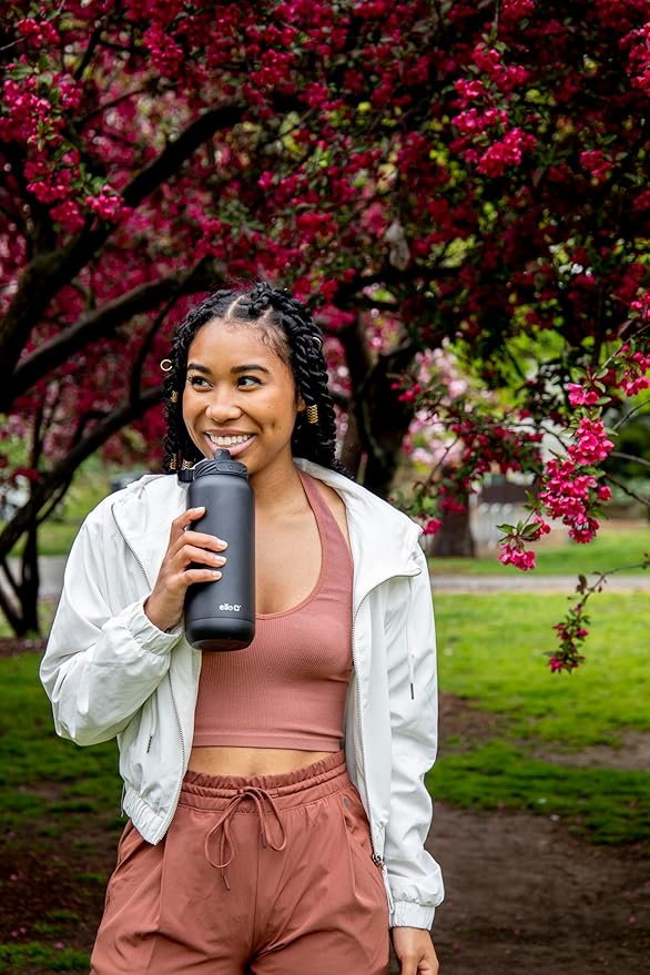 Ello Cooper 32oz Stainless Steel Water Bottle with Straw and Carry Handle, Double Walled and Vacuum Insulated Metal, Leak Proof Locking Lid with Soft Silicone Spout, Reusable, BPA Free, Black