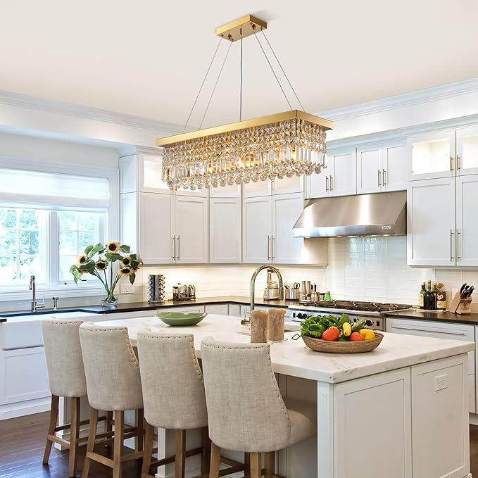 - â¨ăModern Gold Crystal Chandelieră: This modern gold rectangle K9 crystal raindrop chandelier combines simple & minimalist elements which provides sophisticated ambiance and creates a attractive atmosphere in your house. Suitable for dining room, living room, kitchen island, bathroom, bedroom, pool table, office, entry, foyer, office, etc.