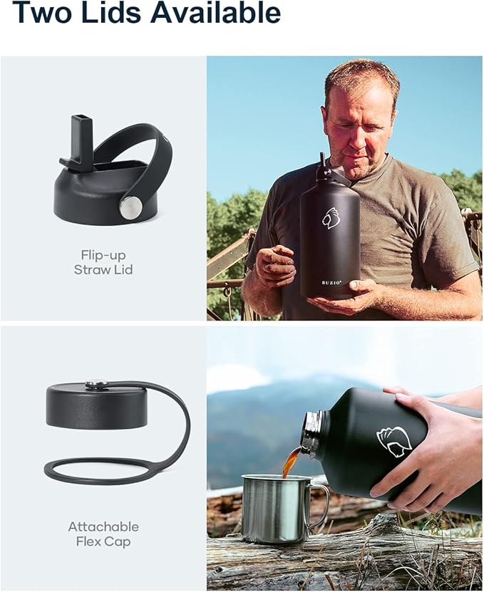 - What You Get: 1 x BUZIO Insulated Water Bottle, 1 x Flip Straw Lid, 1 x Flex Cap, 2 x Straws, 1 x Straw Brush. Hand wash only, do not use abrasives. Do not put it in a freezer or microwave. Be careful when handling hot beverages