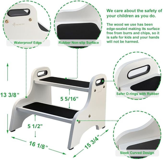 StrongTek Wood 2 Step Stool for Kids with Non-Slip Stepping Surface, Portable Handles, Skid Resistant Foot Pads, and 300 lbs. Capacity, Multipurpose Heavy-Duty Support (White)