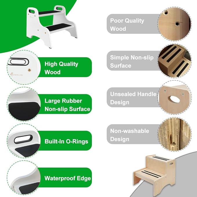 - Heavier-Duty Weight Capacity – The smarter frame design and wooden structure provides our kid’s step stool for a larger 350-lbs. overall weight capacity to ensure babies, toddlers, and even pre-teens can use it.