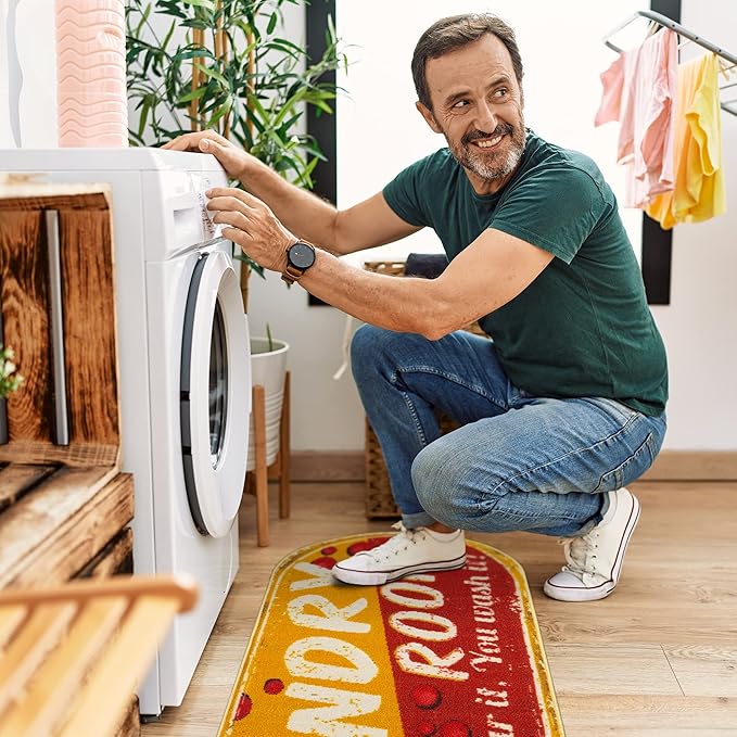 - TRENDY STYLE: This Colorful Bubbles Design Runner Rug features red and yellow background with bubbles and laundry room text adding color and enhancing the look of your home