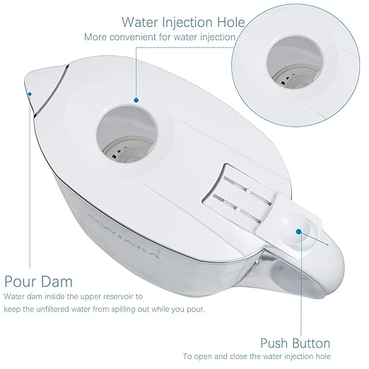 - Safety Materials and Unique Design; The water filter pitchers is BPA free in NSF standard. Non-opening water injection design for the water filter pitcher, no need to take off the cover. Automatic dust-proof filter to prevent dust and other particles from entering.