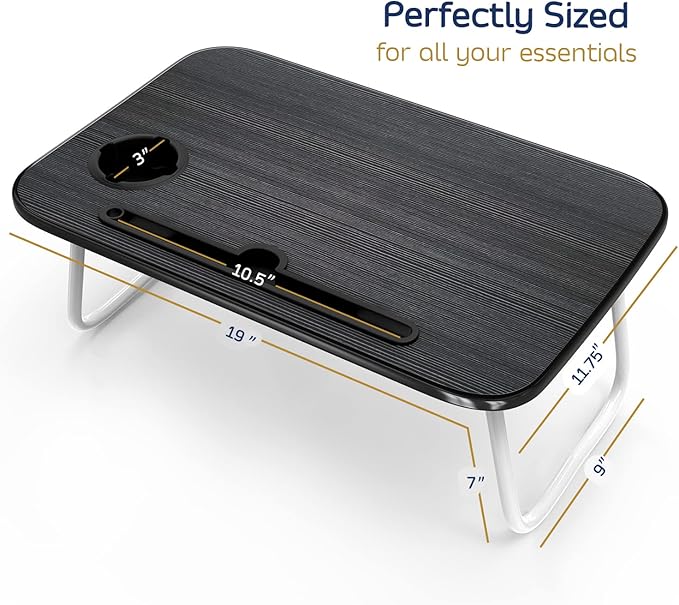- BONUS LAPDESK: The laptop desk features a cup, pen, and tablet holder so you can keep your stuff neat in one place. The desktop measures 19” x 11.75”. Use it as a laptop workstation, laptop table for bed, a children's bed table, a mini writing table, laptop couch table, or a standing table for office work. It becomes the great balance for relaxing and productivity.