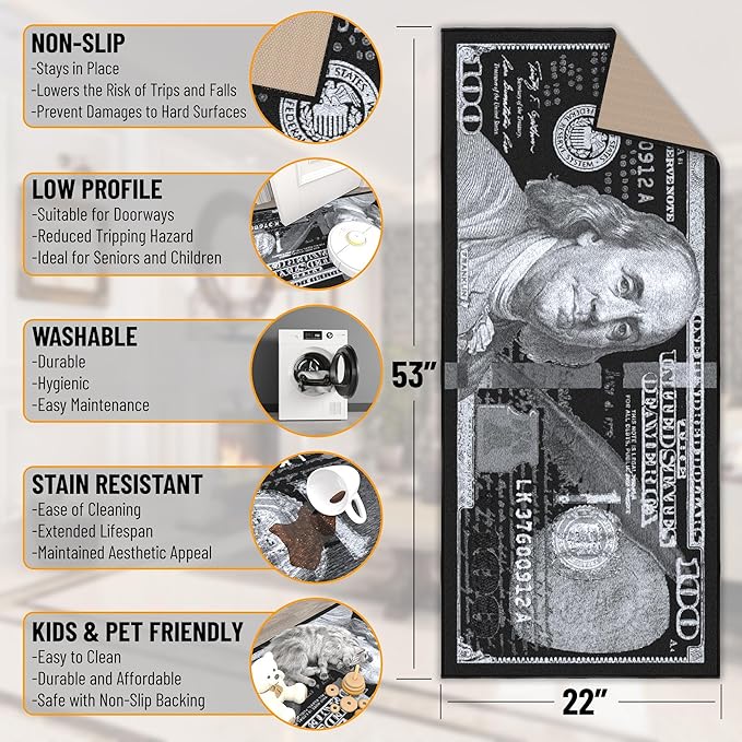 - [TRENDY STYLE]: This Colorful Money Money Rug features a 100 dollar bill print in shades of black, white, and gray while also adding color and enhancing the look of your home. Its timeless design can be integrated into a variety of home décor styles.