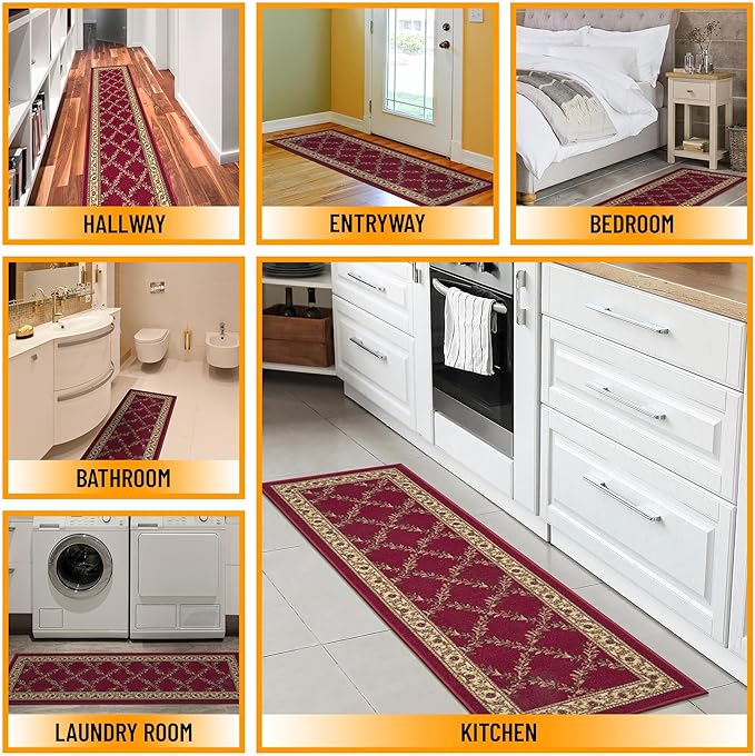 - [TRENDY STYLE]: This Colorful Trellis Design Runner Rug features a solid Red Trellis background with a trellis design adding color and enhancing the look of your home. Its timeless design can be integrated into a variety of home décor styles.